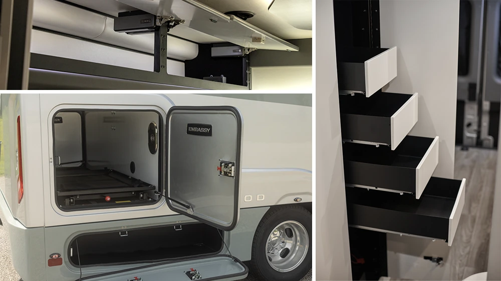 Every cubic inch of an Embassy RV has been efficiently divided and configured to provide more storage than other RV’s in its class. Cabinets upper, lower, and floor to ceiling are designed for easy access and maximum capacity.
