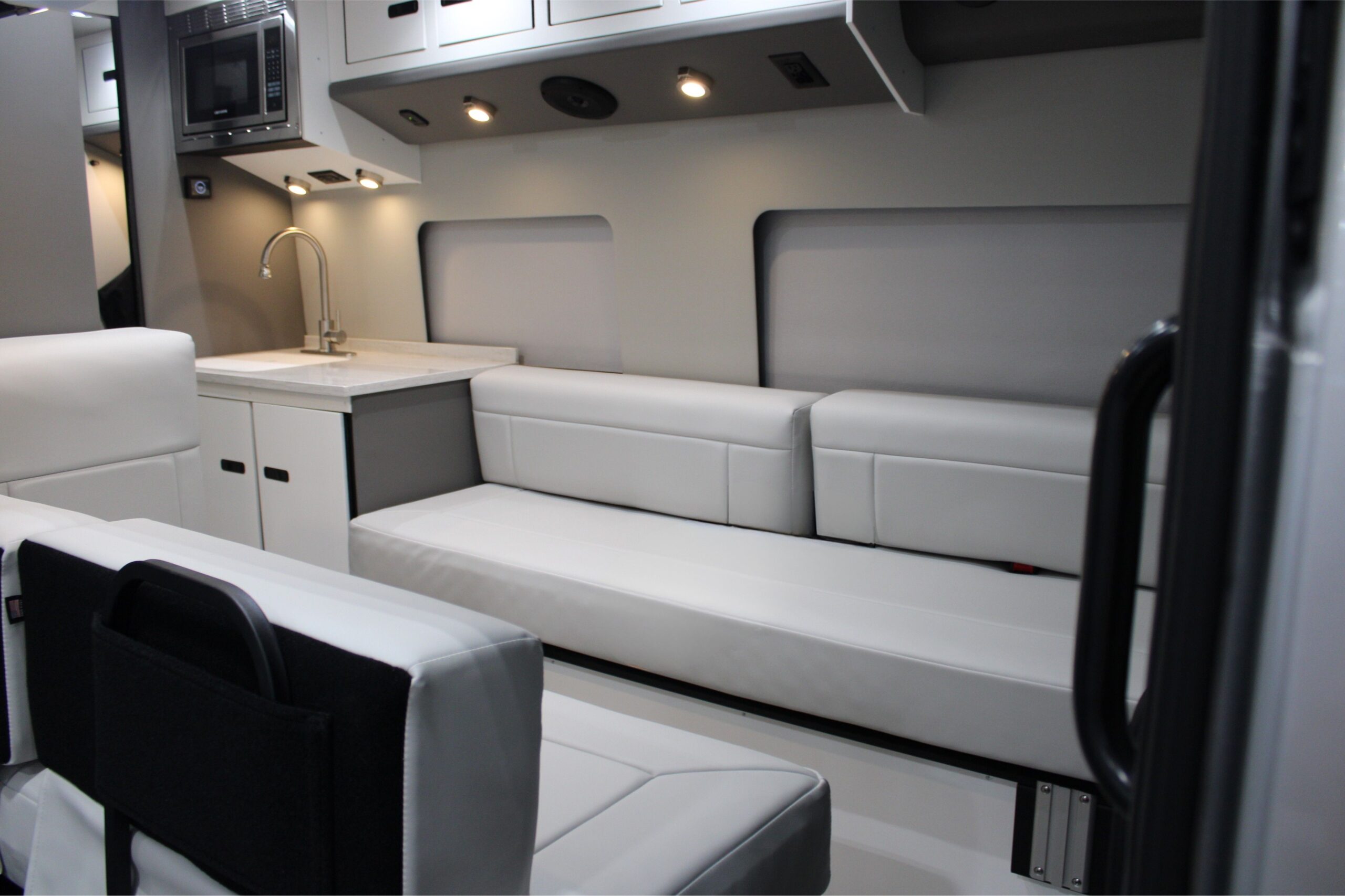 Folding down from its hidden ceiling compartment is the largest HDTV in its class. Includes smart features and additional HDMI connections are easily accessible.
