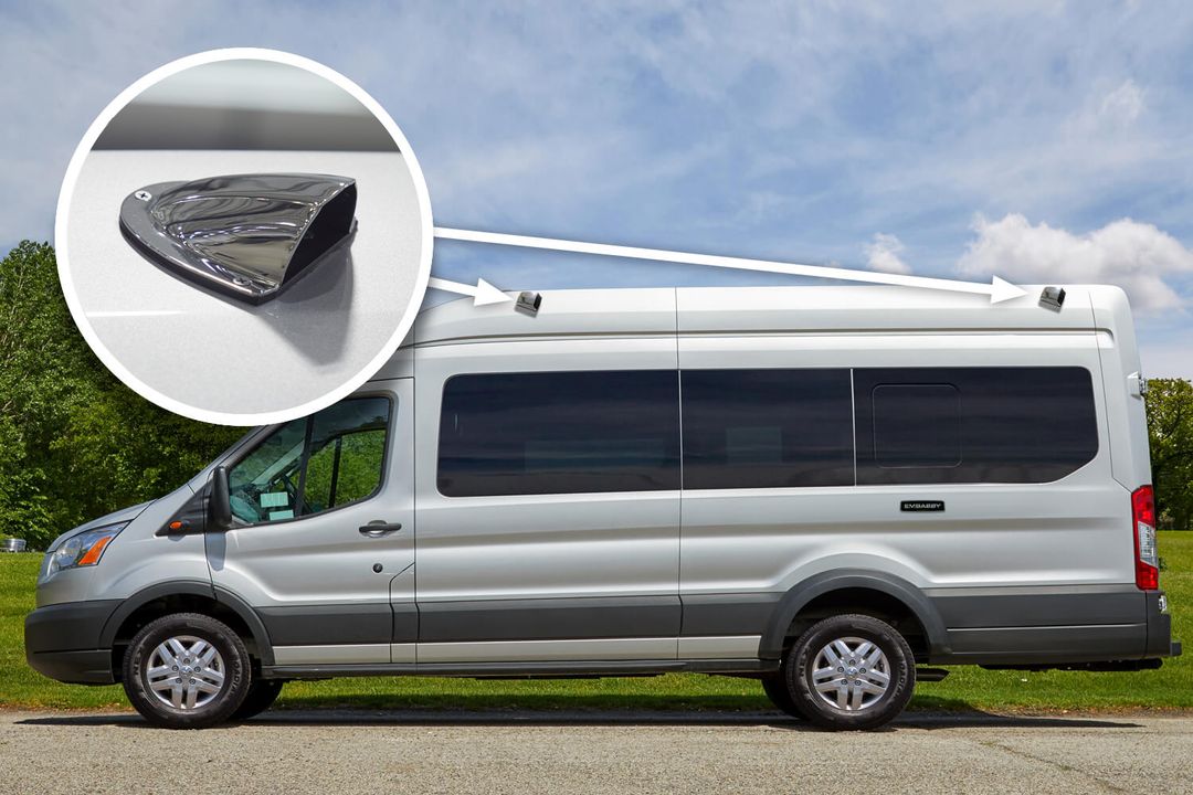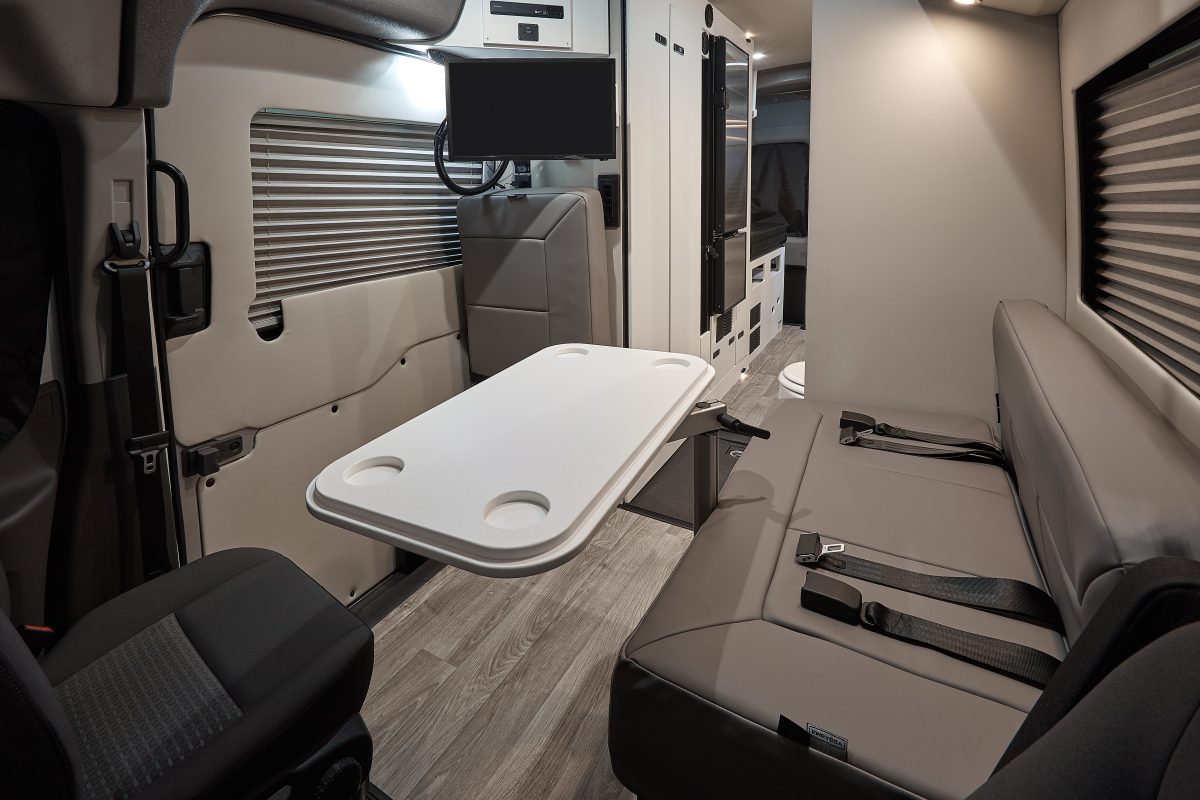 The innovative and efficient floorplan design of the Embassy Dolphin SL is available on the Ford Transit, Dodge Promaster, and applicable Mercedes Sprinter Chassis.