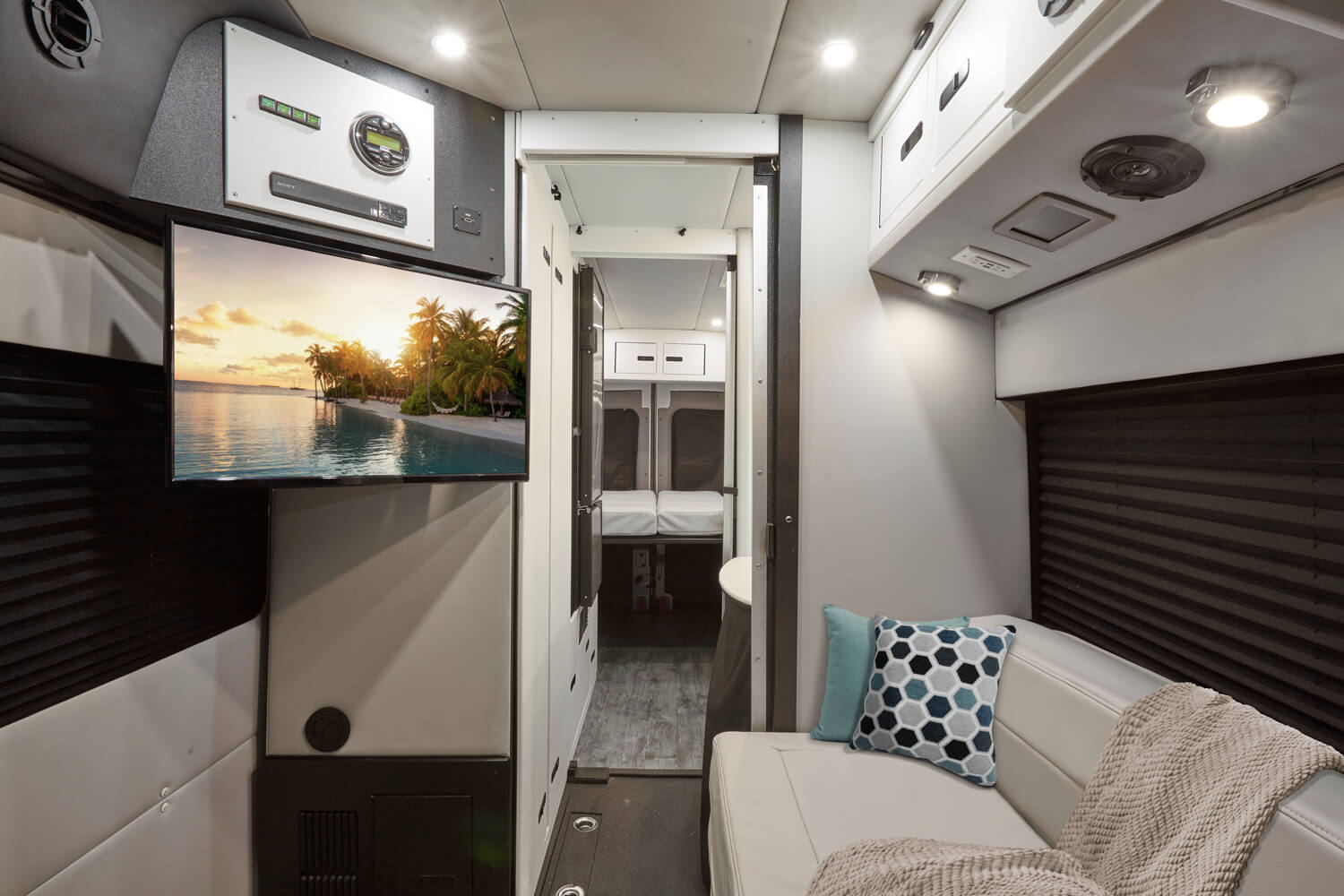 The Embassy® Dolphin SL™ provides two separate sleeping areas: one as a telescoping sofa bed in front and an convertible platform bed in back.