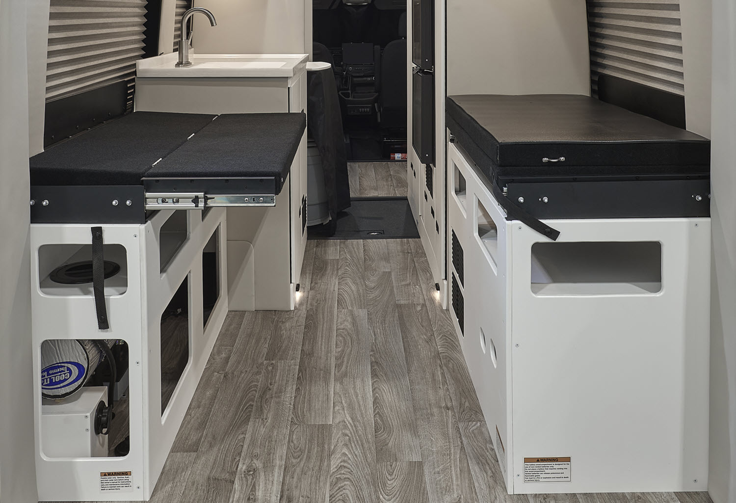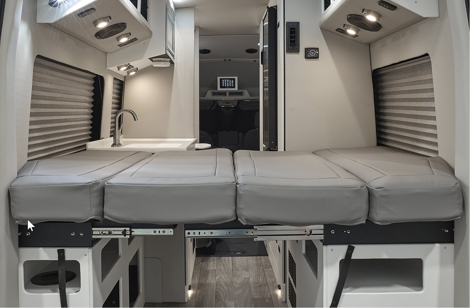 Located in the rear section of the vehicle, this platform bed is more than meets the eye. The 48” x 72″ (Ford Transit Chassis) sleeping space features four, removable triple-density foam cushions supported by two rigid removable platforms that span the lower storage area. Rearrange the cushions and platforms to create a convertible workspace.